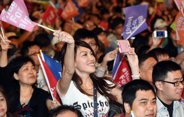 「愛,擁抱台北」大遊行晚上在市府廣場集結,台中民眾熱情揮舞旗幟為柯文哲加油。(記者羅沛德攝)
