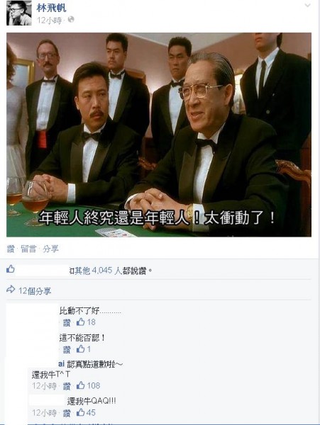 林飛帆今天凌晨在臉書上傳一張令人玩味的照片,是電影《賭神》中,新加坡賭王陳金城對戰賭神時,他對賭神說:「年輕人終究是年輕人,太衝動了!」的畫面,被網友解讀是「認錯」。