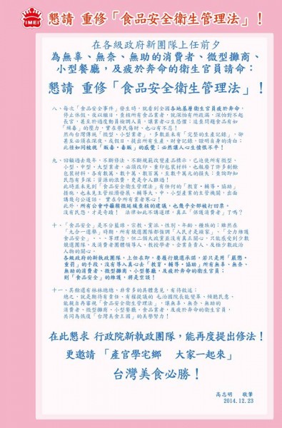 日前大選結果出爐後,最近各縣市的新任縣市政府團隊也即將上任,義美食品就在今天(23日)發表聲明圖文,條列11項訴求為消費者和餐廳攤商以及疲於奔走的衛生官員請命,希望政府能夠重修「食品安全衛生管理法」。