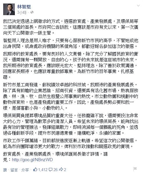 林智堅今在臉書上透露,他的理念只求用人唯才,「只要有心服務新竹市民的高手,不管她或他出身民間,或身處政府機關的某個角落,都歡迎報名參加這次的徵選。」
