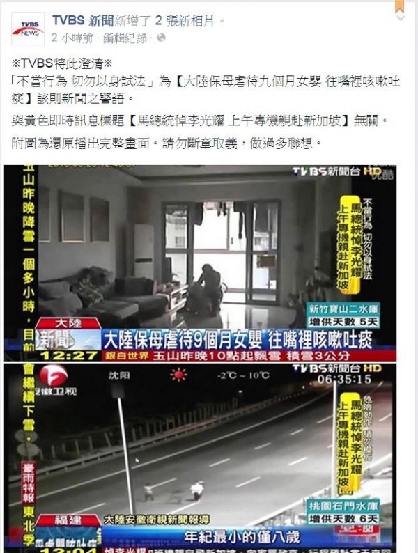 《TVBS》今天(24日)播報中國保母虐待女嬰的新聞時,電視畫面為此標上「不當行為 切勿以身試法」警語,沒想到恰與「馬總統悼李光耀 上午專機親赴新加坡」標題緊臨出現,讓許多網友因此擷圖,並分享到社群網路上,引發網友議論。
