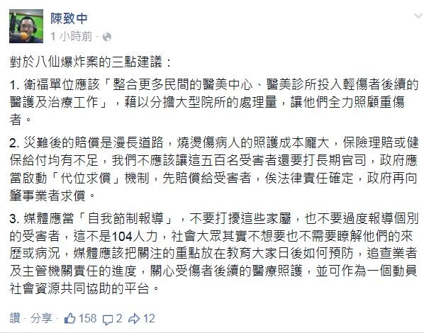 陳致中晚間透過臉書對八仙粉塵爆炸案提出3點建議,尋求醫美診所參與救治、政府啟動代位求償、媒體自我節制。