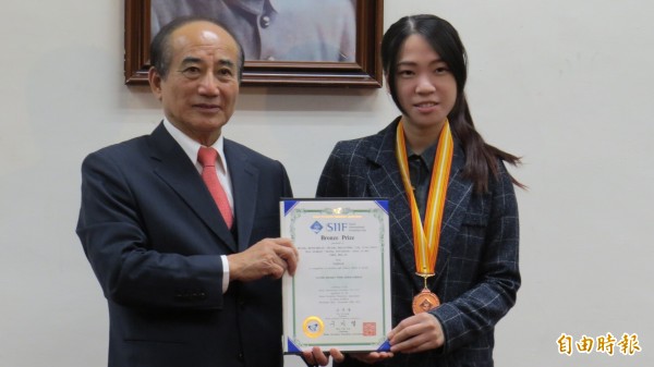 立法院長王金平鼓勵在國際發明展獲獎的得獎者。(記者陳鈺馥攝)
