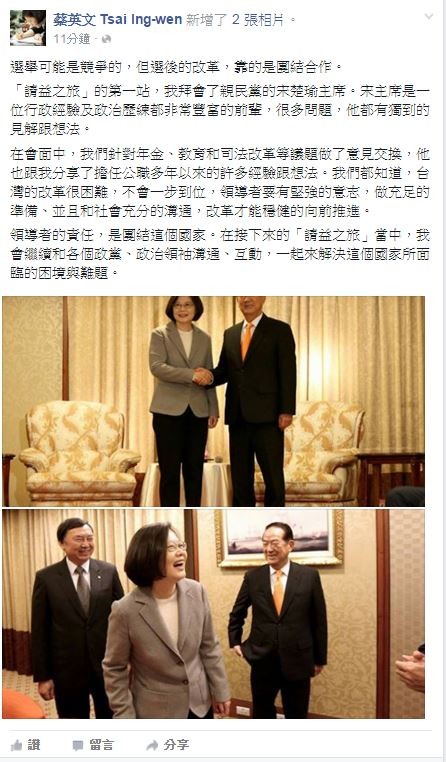 與宋楚瑜談話結束後,蔡英文在臉書上PO文說,宋楚瑜是一位行政、政治歷練都相當豐富的前輩,兩人都認為,台灣改革很困難,領導者要做足準備和社會充分的溝通才能穩健的帶台灣向前。