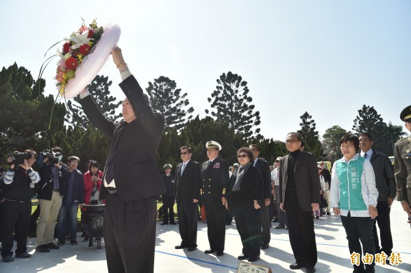 準行政院長林全今天返回高雄市左營區,與高雄市長陳菊、軍眷二代一起到海軍忠烈將士紀念塔向英靈獻花。(記者張忠義攝)