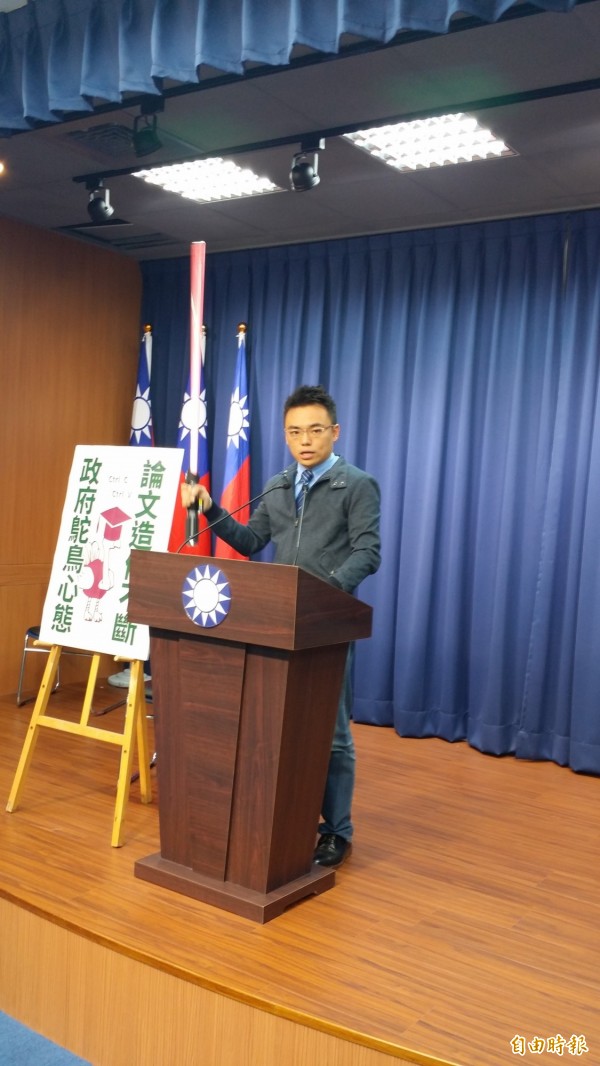 針對台大再爆論文掛名收錢的學術醜聞案,國民黨今早召開記者會痛批有違學術倫理、道德倫喪,教育部與台大卻以駝鳥心態處理,除呼籲教育部應要求涉及論文造假案掛名的台大校長楊泮池下台,並質疑民進黨立委當年要求馬政府時代涉及論文造假掛名的前教育部長蔣偉寧、涉及論文抄襲的前國防部長楊念祖下台,今日應以同一標準處理此事。