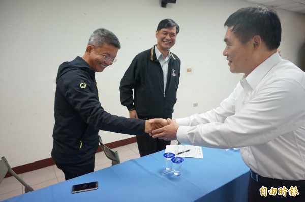 郝龍斌與宜蘭縣黨部黨代表握手致意,爭取支持。(記者林敬倫攝)