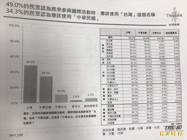 至於參與國際活動使用的名稱,49%認為要用「台灣」,34.3%支持使用「中華民國」,僅10%支持「中華台北」。