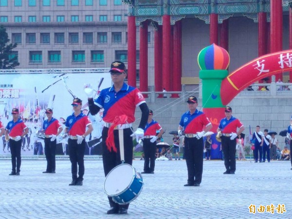 今在自由廣場兩廳院藝文廣場,舉辦「高中職校儀隊競賽」,中正預校鼓號樂隊校友團參與演出,成員張景晃(前)雖罹患癌症,仍頂著高溫奮力擊鼓。(記者涂鉅旻攝)