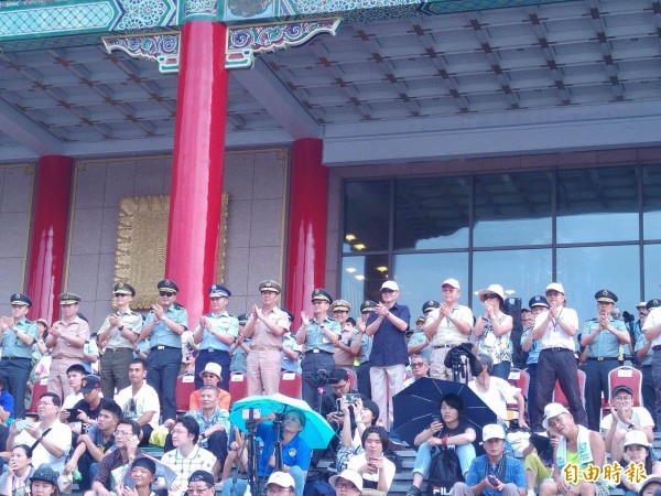 中正預校鼓號樂隊校友團表演結束後,國防部長馮世寬(身穿藍衣者)率高階軍官起立鼓掌。(記者涂鉅旻攝)