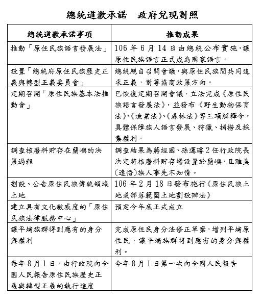 總統蔡英文去年向原住民道歉,原民會也整理對照表,強調各項承諾都在努力推動。(圖:原住民族委員會提供)