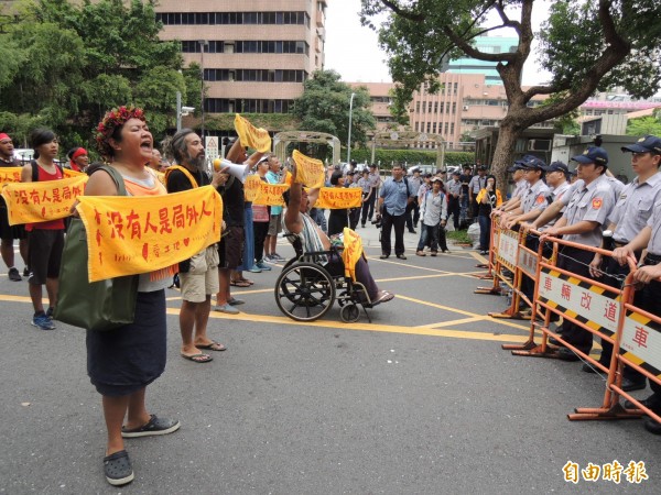 抗議原住民族傳統領域劃設辦法,20多名原住民在全國原住民行政會議場外高喊口號。(記者黃邦平攝)