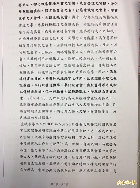 根據刑事自訴狀,國民黨指出,吳沛憶、張志豪稱國發院土地乃「不義之財」,依據教育部辭典,「不義之財」指的是用不正當手段所獲取之錢財,為貶抑、負面詞,而吳、張2人故意迴避相當查證義務,發表不實言論,凸顯其惡意攻訐。