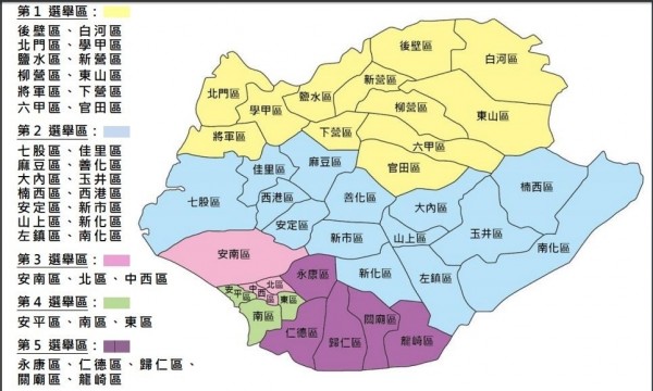 南市現行第9屆立委選舉區劃分,目前有5席立委。(記者洪瑞琴翻攝)
