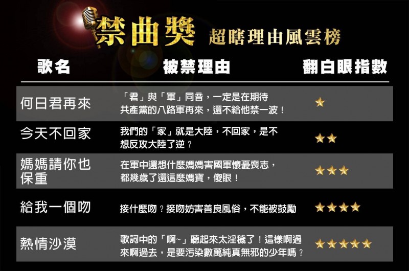 根據內政部粉絲專頁貼出的禁曲獎風雲榜,鄧麗君名曲「何日君再來」被禁的理由,是因為「君」字與「軍」字同音,「一定是在期待共產黨八路軍再來」,所以「還不給他禁一波!」