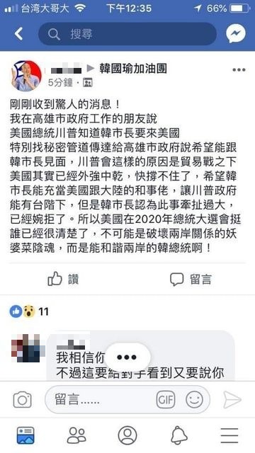 日前一名韓國瑜粉絲在「韓國瑜加油團」上PO文稱,他在高雄市政府的朋友告知,川普知道韓國於即將訪美,特別透過秘密管道向高市府傳達求見韓國瑜,之所以川普會找上韓國瑜,是因為美國在貿易戰下外強中乾,快撐不住了,希望韓國瑜能扮演和事佬的角色。