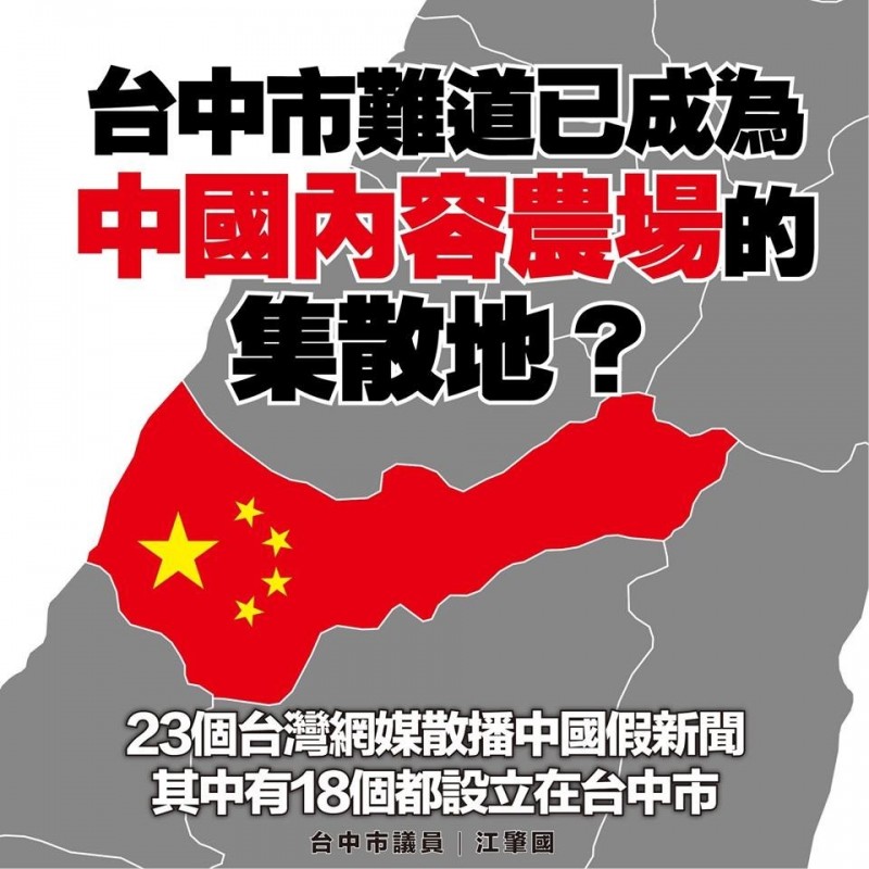 江肇國調查,轉發中國造假新聞的23家媒體,除2家查無資料,新北市、宜蘭縣及中國北京市各1家,其餘18家登記在台中,地域性非常明顯。台中可能已被中國內容農場大量滲透,成為傳遞中國假新聞的集散地而不自知。