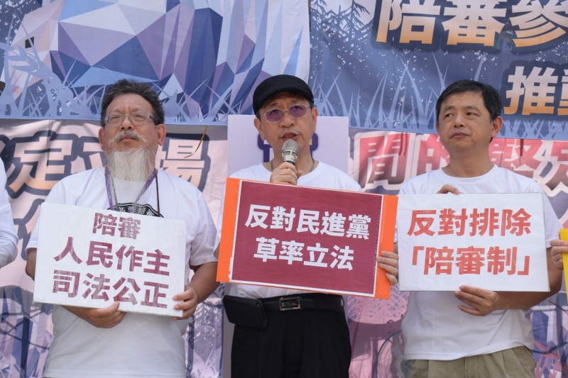律師張靜(左起)、民間司改會董事長林永頌及律師鄭文龍等人召開記者會,呼籲參審、陪審應該一併試行。(民間司改會提供)