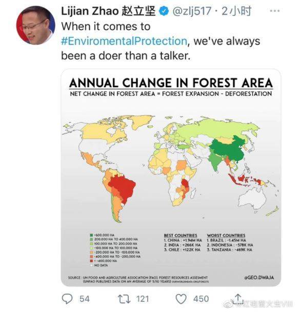 趙立堅昨在推特發布1張世界地圖,原想藉由說明各國森林覆蓋比率變化,回擊外界關於「中國汙染地球」的指控,不料圖中台灣顏色和中國不一,且西藏南部,阿克賽欽、喀什米爾等中國國土爭議地區,也劃分成了印度領土,讓中國網友大為不滿,中國知名軍事微博部落客「紅袍螢火蟲VIII」更發文批評。