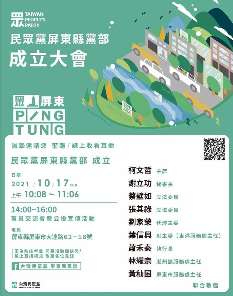 民眾黨屏東縣黨部將在17日在屏東市舉行成立大會。(記者葉永騫翻攝)
