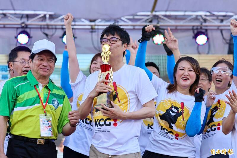 高市府龍舟隊在府會龍舟賽勝出,市長陳其邁親吻獎盃。(記者王榮祥翻攝)