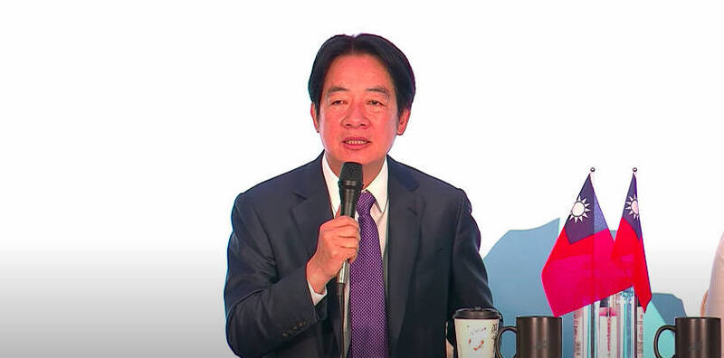 民進黨正副總統候選人賴清德、副總統候選人蕭美琴今召開選前國際記者會,現場佈置簡約,但桌面特別擺放兩支中華民國國旗,賴清德以全英語致詞,重申將延續蔡英文總統兩岸政策。(圖擷取自YouTube直播)