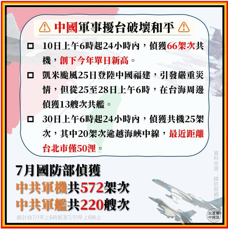 民進黨中國事務部下午指出,7月國防部偵獲中國軍機572架次、軍艦220艘次,譴責中共以此恫嚇台灣。(圖由民進黨中國事務部提供)