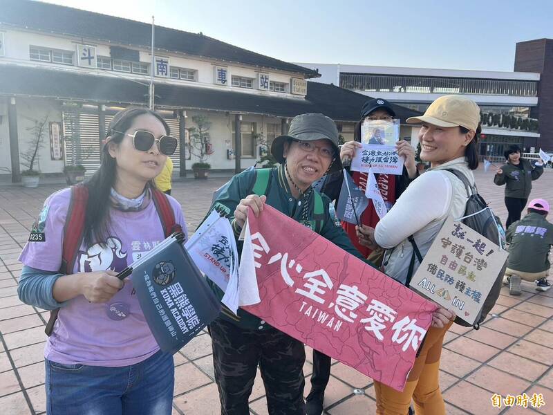 由黑熊民防教育協會(黑熊學院)發起的「Stand up as Taiwan 台灣主站派.接力護台灣」串連計畫,今(3日)進入第4天行程,從雲林斗南火車站出發,吸引來自北中南各地約數十人相挺,其中72歲陳得民連走第4天,已走100多公里,他說,這是發揮台灣意識、讓台灣更好的機會,歡迎大家大聲說「挺台灣」。