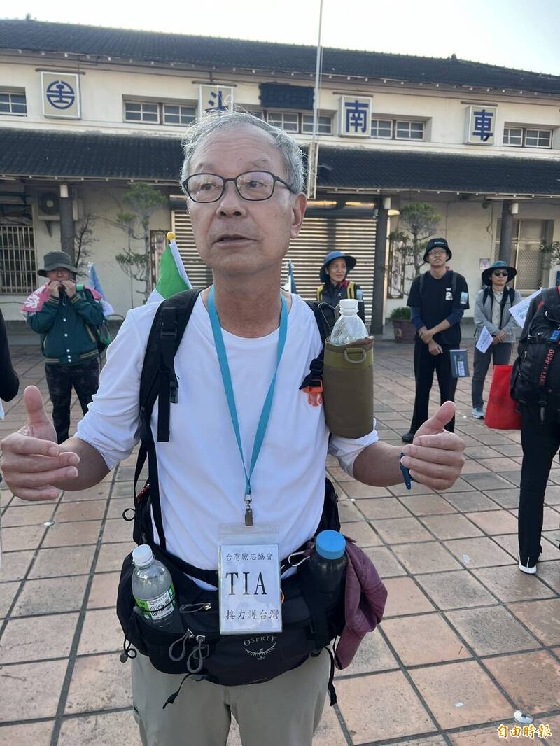 72歲陳得民連續參加第4天,前3天已走了逾100公里,他說現在是發揮台灣意識、讓台灣更好的機會,歡迎大家大聲說「挺台灣」。(記者黃淑莉攝)