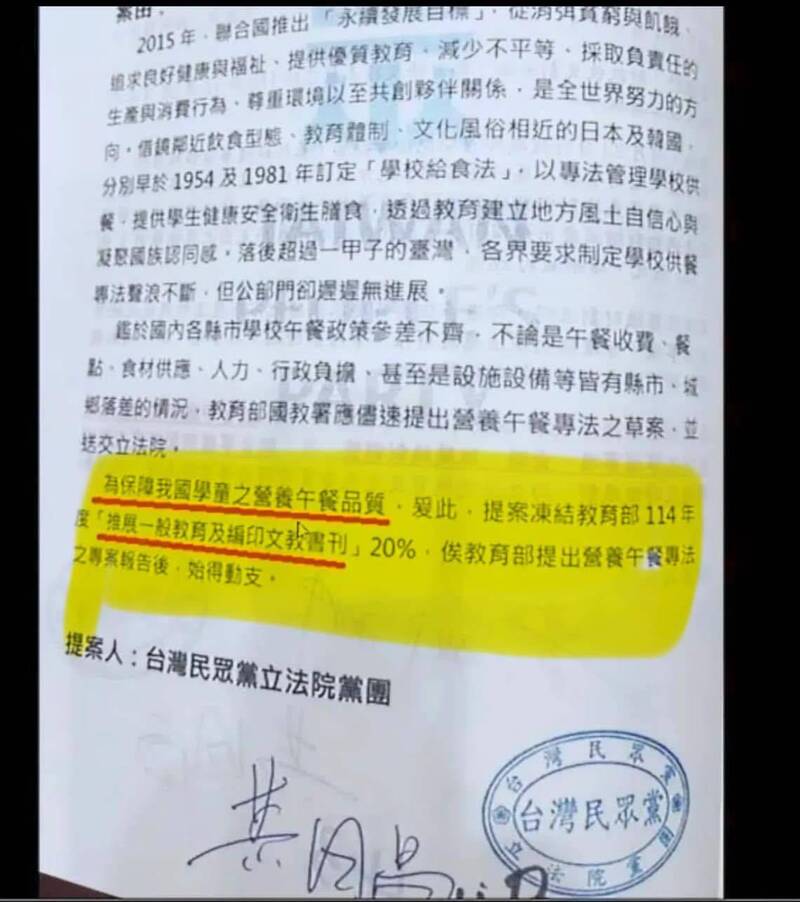藍白立委聯手表決通過多項預算刪減案,引發外界反彈,律師林智群今日分享,民眾黨立院黨團其中一項提案,竟稱為保障營養午餐品質,提案凍結「推展一般教育及編印文教書刊」20%,讓林智群酸黃「營養午餐是餵學生啃書本嗎?」有網友也在社群分享,資深媒體人尚毅夫在政論節目上也怒嗆「我們學校是餵學生吃紙嗎?會不憤慨嗎?」