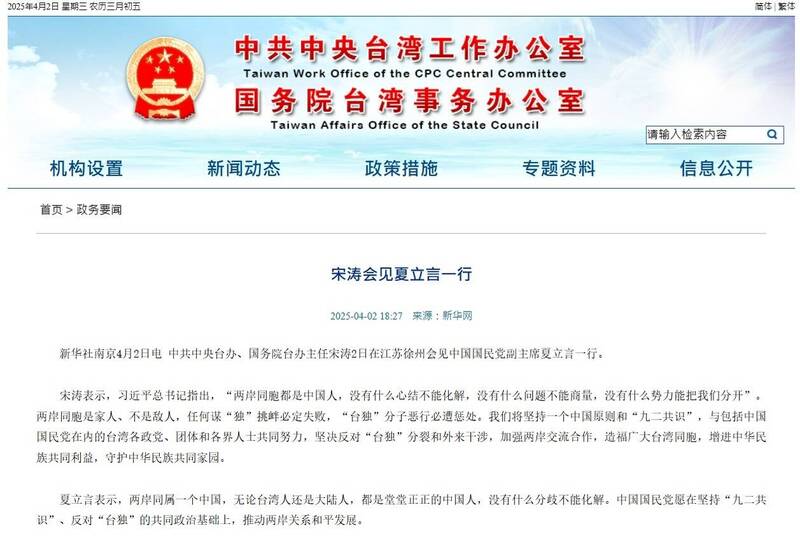 國台辦官網今日已收錄宋濤會見夏立言的資訊,夏立言對宋濤說,「兩岸同屬一個中國,無論台灣人還是大陸人,都是堂堂正正的中國人,沒有什麽分歧不能化解」。 (圖擷取自國台辦官網)