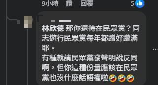 網友們看到貼文後紛紛留言「你不用這樣侮辱人,顯得自己霸道無理」、「民眾黨的我還真不意外 呵呵」、「你是不是父母跟學校都沒教你尊重?可憐的中年人」、「看了黨再看人,算了,正常發揮」、「長這什麼鳥樣還有臉講別人,果然民眾黨的草男都有莫名自信」、「那你還待在民眾黨?同志遊行民眾黨每年都蹭好蹭滿耶,有種就請民眾黨發聲明說反同啊,但你這種份量應該在民眾黨也沒什麼話語權啦」。
