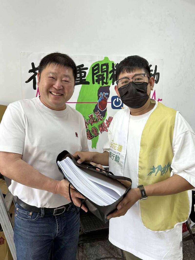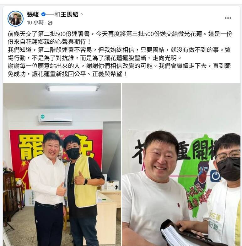 前國民黨花蓮縣黨部主委、花蓮縣議長張峻本月初響應罷免傅崐萁的行動,昨天再度繳出500份連署書。 (翻攝張峻臉書)