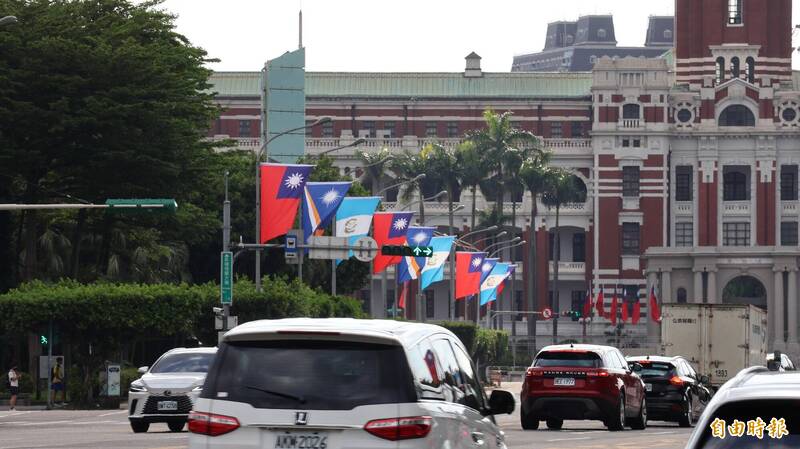 凱達格蘭大道已經懸掛馬紹爾群島與瓜地馬拉國旗,迎接友邦總統來台。(記者黃靖媗攝)