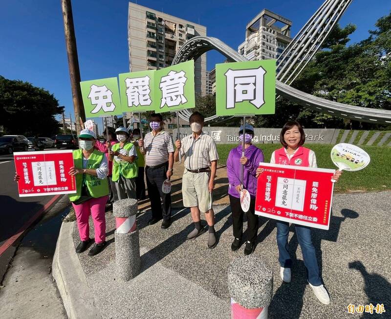 台中市民進黨議員陳淑華等綠營民代,呼籲選民協助爭取更多看板曝光機會,歡迎與服務處聯繫吊掛。陳淑華表示,距同意罷免投票日僅剩3週,下午跟「中四廢翔」志工、民眾及里長,在文心路、甘肅路口站路口,同時也配合全國性護國大遶境,要在7月26日催出罷免同意票。