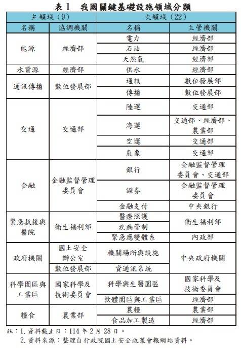 報告指出,行政院國土安全辦公室配合國家政策方向,於今年2月修正最新版關鍵基礎設施領域分類表,新增攸關社會民生韌性的「糧食」為第9大主領域,以及其項下「農糧」及」「食品加工製造」2項次領域。