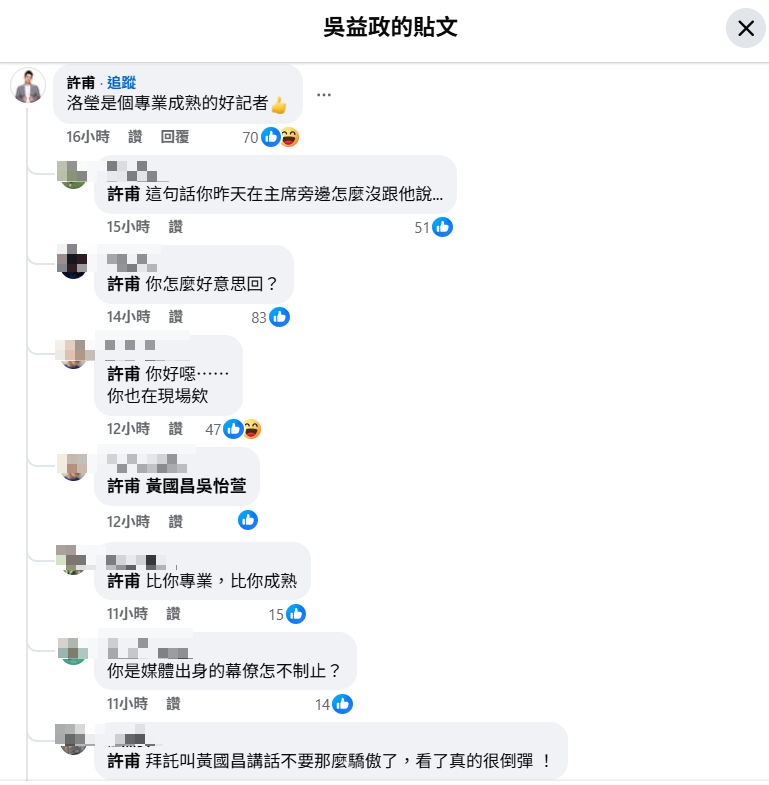 許甫稱讚被黃國昌嗆「白癡問題」的吳洛瑩是專業成熟的好記者,被其他網友砲轟馬後炮。(擷取自臉書)