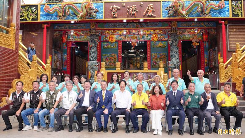 賴清德赴七堵慶濟宮參香、與黨員座談,與民進黨祕書長徐國勇、副秘書長何博文、立委王正旭、基隆市副市長邱佩琳、慶濟宮主委柯金標等人和廟方人員合影。(記者陳逸寬攝)