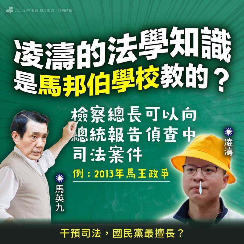 吳崢指出,國民黨智庫副執行長凌濤日前公然宣稱,檢察總長依法要向總統報告個案,殊不知史無前例、後無來者這樣做的,正是國民黨的前總統馬英九;再者,民眾黨帶領支持者違法包圍檢調、煽動仇視司法人員,甚至攻擊執法人員,真正大剌剌干預司法的不正是藍白兩黨?