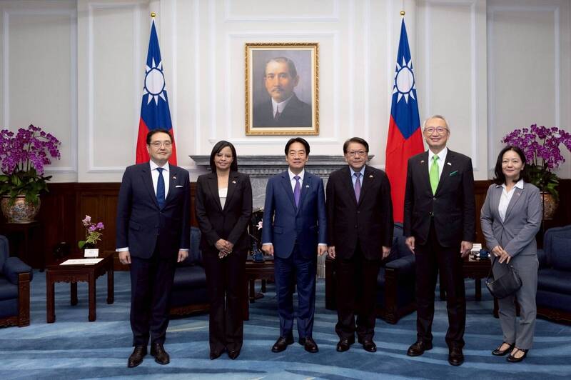 賴清德總統接受貝里斯新任駐台大使梅凱瑟(左二)呈遞到任國書,表示已開放貝里斯冷凍白蝦等水產品進口,將繼續深化經貿與投資關係。(總統府提供)