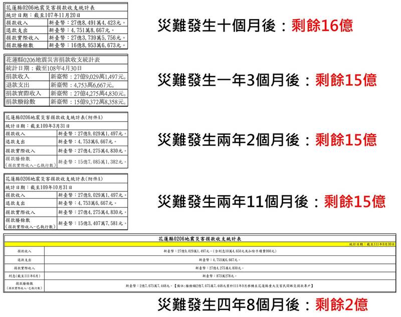 四叉貓貼出花蓮2018年0206地震災害捐款收支統計表為例。他表示,當時花蓮縣收到將近28億的善款,災難發生後10個月,還剩下16億,災難發生後約3年,還剩下15億,「然後忽然之間,只用一年多就花光了?(剩下2億)」他建議網友,把善款捐給更值得信賴的專戶,他也批:「花蓮縣政府運用善款的執行率超級低,使用也缺乏公開透明。」