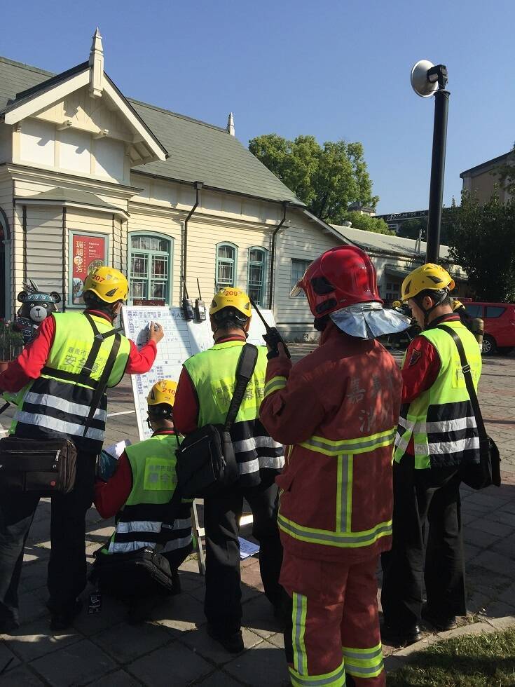 嘉市消防局日前辦理木構造房屋建築群古蹟防災訓練。(嘉市消防局提供)