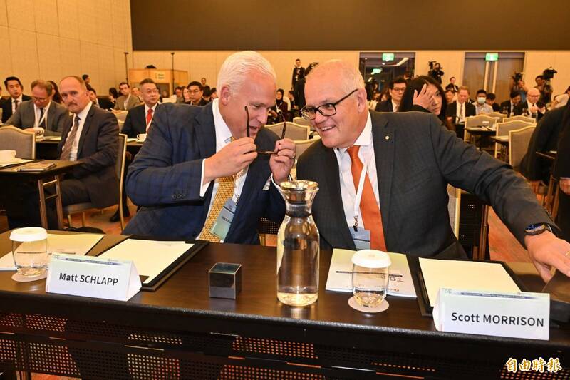 澳洲前總理莫里森(右)8日與美國保守聯盟主席施萊普(Matt Schlapp)出席2025台北安全對話。(記者田裕華攝)