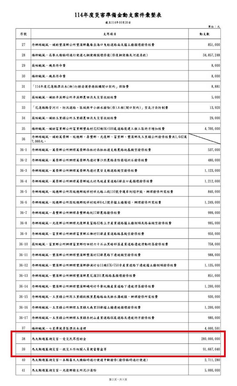 民進黨花蓮縣議員胡仁順今天下午在臉書PO出花蓮114年度災害準備金動支案件彙整表,特地以紅框圈出「馬太鞍堰塞湖災害-救災工作相關人員便當餐盒等」、「馬太鞍堰塞湖災害-受災民眾慰助金」這2筆支出細項,可以看到前者花了9166萬7040元,後者則是2億8000萬元。