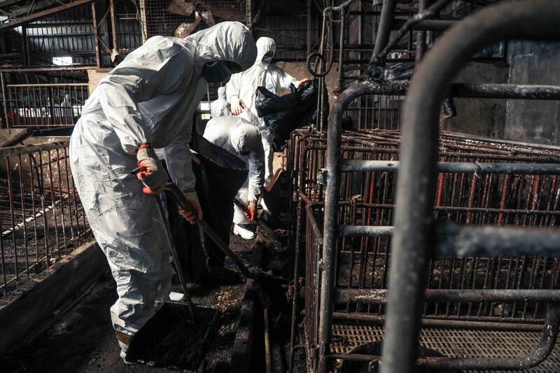 張育萌昨深夜發文強調,一間梧棲養豬場,徹底揭開台中市府的「世紀級人禍」。圖為國軍與化學兵在梧棲養豬場現場清消。(軍方提供)