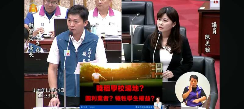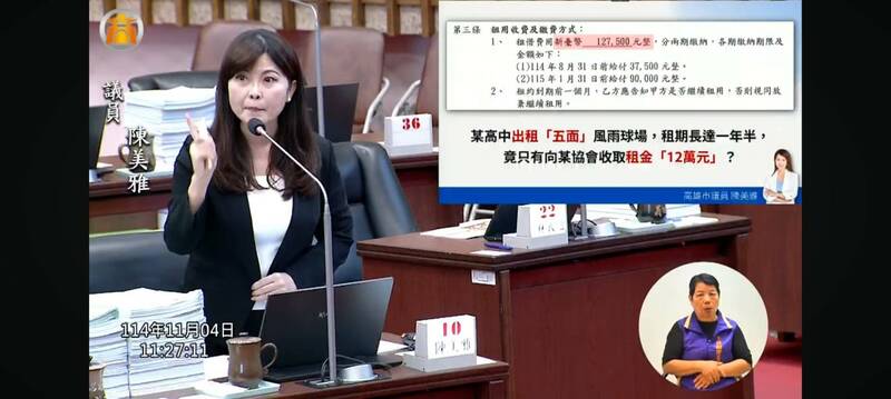 陳美雅引述高市高級中學以下學校場地使用管理規則,評估5面籃球場租給外界1年半,應該可收取超過3百萬元租金,強烈質疑這件球場租賃案有賤租、圖利之嫌?驅趕民眾也違反校園使用規範,批評教育局嚴重失職。