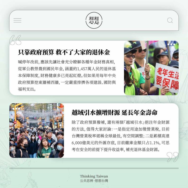 蔡英文說,面對年金改革的議題,整個社會必須堅守理性、專業,讓改革持續、讓制度永續,更重要的是,財源要擴增,尋找新的專屬財源。她也再次分享想想論壇的兩篇新文章,包含「迫切的危機》只靠政府預算 救不了大家的退休金」、「財務須開源》越域引水擴增財源 延長年金壽命」,期待在「公平」與「永續」的原則下,共同找出豐沛財源,為台灣下一代留下令人安心的制度。