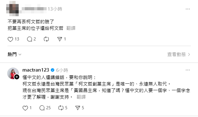 近日有網友在Threads上留言「不要再丟柯文哲的臉了!把黨主席的位子還給柯文哲!」,沒想到竟釣出麥玉珍回覆,「懂中文的人還講錯話,要和你說明:柯文哲永遠是台灣民眾黨『柯文哲創黨主席』是唯一的、永遠無人取代。現在台灣民眾黨主席是『黃國昌主席』,知道了嗎?懂中文的人要一個字、一個字念才更了解喔,謝謝支持。」