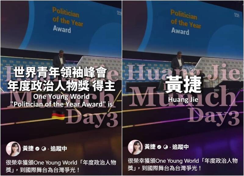 黃捷昨於臉書粉專發文提及,她非常榮幸以台灣首位得獎者的身分,到德國接受One Young World世界青年領袖峰會頒發的「年度政治人物獎」。