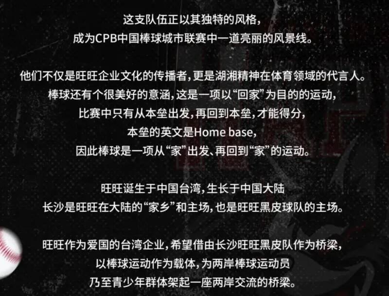 周軒在臉書PO文表示,中國棒球城市聯賽,叫做CPB,昨天11月11日官宣第一支隊伍,叫做長沙旺旺黑皮隊,想也知道,這是蔡衍明的球隊「旺旺誕生於台灣,生長於大陸,長沙是旺旺在大陸的家鄉與主場,希望藉由旺旺為兩岸棒球運動員搭起一座交流橋樑。」